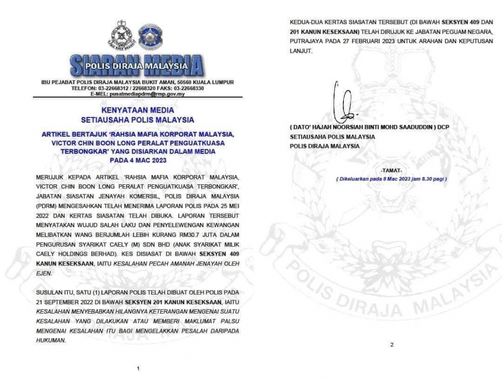 Isu mafia Korporat Victor Chin Boon Long bukan baru. Sejak didedahkan sejak tahun 2023 rampasan terhadap syarikat Caely (Classita Holdings). PDRM ketika itu mengesahkan menyiasat Mafia Korporat serta penyelewengan kewangan melibatkan wang berjumlah lebih kurang RM30.7 juta dalam satu syarikat dikaitkan Victor Chin Boon Long iaitu Syarikat Caely Holdings Berhad (Classita) di bawah seksyen 409 kanun keseksaan, iaitu kesalahan pecah amanah jenayah oleh ejen. Mungkinkah kes ini akan dibuka semula?