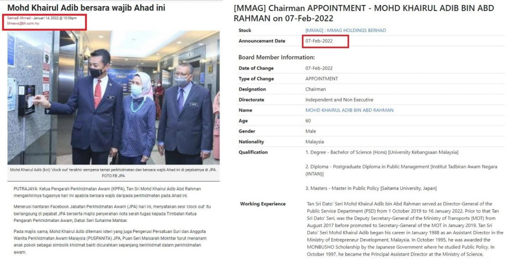 Hanya sebulan selepas bersara, pada 7 Februari 2022, Tan Sri Adib dilantik sebagai Pengerusi MMAG Holdings — sebuah lagi entiti yang berada dalam orbit kawalan Victor Chin. Pelantikan pantas ini menimbulkan syak wasangka memandangkan Victor Chin berjaya merampas syarikat M Jets International Sdn. Bhd pengendali Kargo Xpress asalnya milik M Gunasekar dan Philip Phang Kin Ming. Tan Sri Adib juga bekas Pengerusi Pihak Berkuasa Penerbangan Awam Malaysia (CAAM) dan Lembaga Pengarah Malaysia Airport Holdings Berhad (MAHB) sebagai ‘kabel’ besarnya untuk akses lesen penerbangan dan gangguan dari CAAM serta projek MAHB dan Malaysia Aviation Group (MAG)