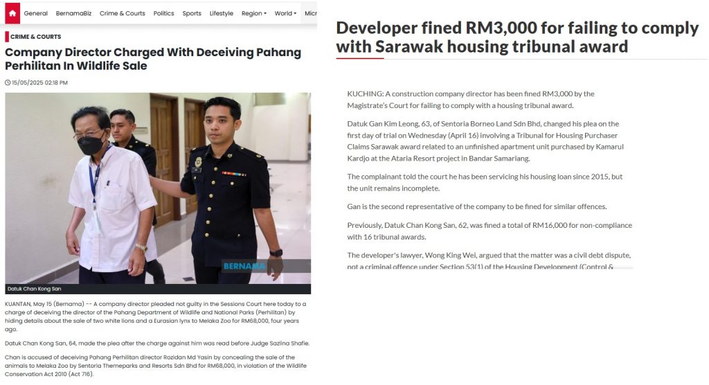 Pelbagai kes mahkamah ditempuhi seperti Datuk Chan Kong San pada Mei lalu dituduh di mahkamah memperdaya Pengarah Jabatan Perlindungan Hidupan Liar dan Taman Negara (Perhilitan) Pahang dengan menyembunyikan maklumat berkaitan penjualan dua ekor singa putih dan seekor lynx Eurasia bernilai RM68,000 kepada Zoo Melaka melalui syarikatnya Sentoria Themeparks and Resorts Sdn BhdDato’ Gan Kim Leong pada April didenda RM3,000 oleh Mahkamah Majistret kerana gagal mematuhi anugerah Tribunal Tuntutan Pembeli Rumah Sarawak. Abangnya Datuk Chan Kong San didenda sejumlah RM16,000 kerana gagal mematuhi 16 anugerah tribunal.
