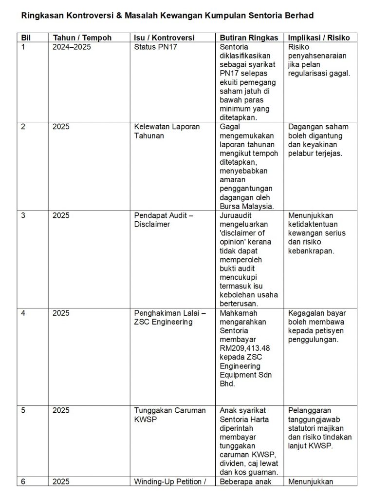 Kesemua perkembangan ini memperlihatkan bahawa masalah Sentoria bukan sekadar satu tuntutan hutang atau satu kes tunggakan KWSP, tetapi mencerminkan krisis berpanjangan merangkumi aspek kewangan, tadbir urus dan pengurusan risiko.