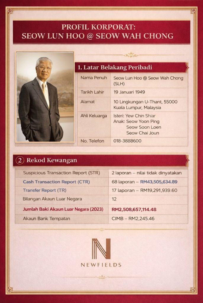- Kewujudan akaun luar negara bernilai lebih RM2.5 bilion yang dikaitkan dengan Seow Lun Hoo