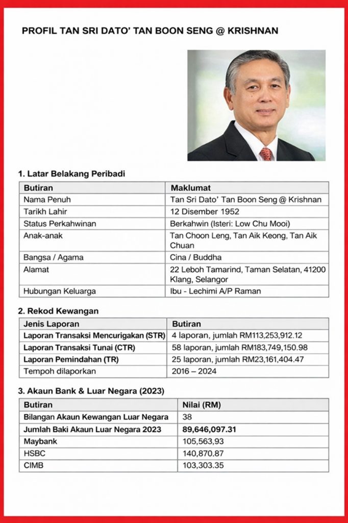 - Rekod simpanan luar negara hampir RM90 juta yang didakwa berkait dengan Tan Sri Krishnan Tan