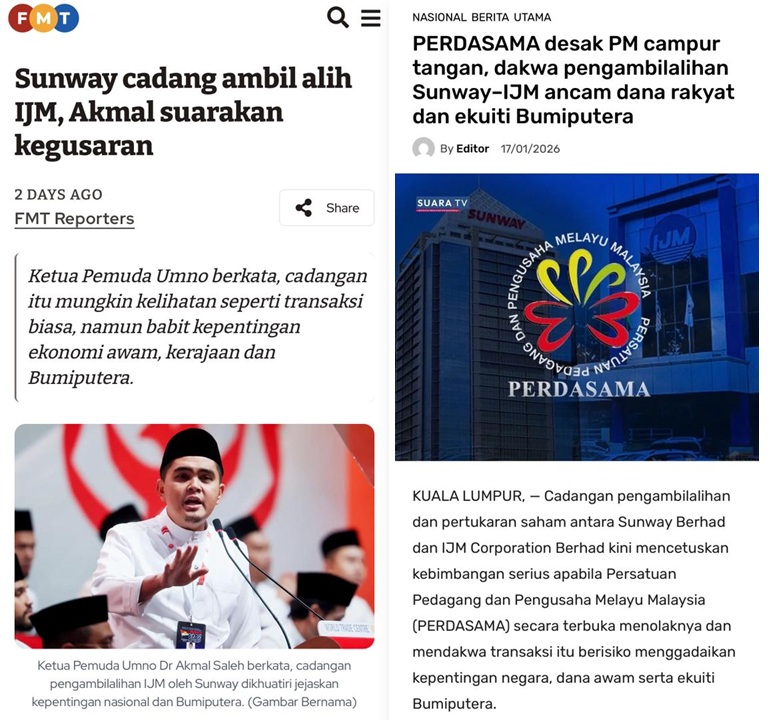 Buktinya penentangan terhadap cadangan tersebut turut disuarakan secara terbuka oleh Ketua Pemuda UMNO, Dr Akmal Saleh, yang mempersoalkan rasional menjual IJM sedangkan syarikat itu masih mencatat keuntungan dan beroperasi secara stabil. Persatuan Pedagang dan Pengusaha Melayu Malaysia (PERDASAMA) dan Dewan Perniagaan Melayu turut memberi amaran bahawa pengambilalihan tersebut berpotensi menggugat pegangan ekuiti Bumiputera, meletakkan nilai terlalu rendah ke atas IJM serta menjejaskan kepentingan ekonomi negara dalam jangka panjang.