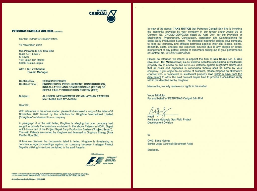 Dua pelanggaran paten milik Kingtime International Ltd oleh Petronas dan Petrofac yang telah kalah di Mahkamah Rayuan dan Persekutuan namun Petronas telah menganugerahkan kontrak EPCIC ( Engineering, Procurement, Construction, Installation & Commissioning) bernilai USD250 juta kepada Petrofac untuk membekalkan dan menghantar sebuah MOPU, struktur sokongan “wellhead” yang boleh dikeluarkan, dan kapal Penyimpanan dan Penumpahan Terapung bagi medan Sepat.