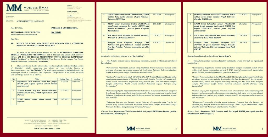 Tengku Taufik Presiden Petronas sanggup mengupah firma guaman Moideen & Max Advocates and Solicitors dimiliki Muhammad Faisal Moideen and Maximilian Tai. Peguam Faisal Moideen itu hari-hari membalun Kerajaan Perpaduan, PMX Anwar Ibrahim, menteri-menteri kabinet dan dasarnya. Peguam macam ini dibayar Presiden Petronas untuk mempertahankannya.