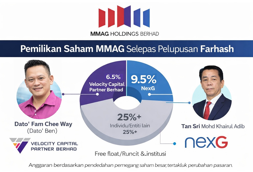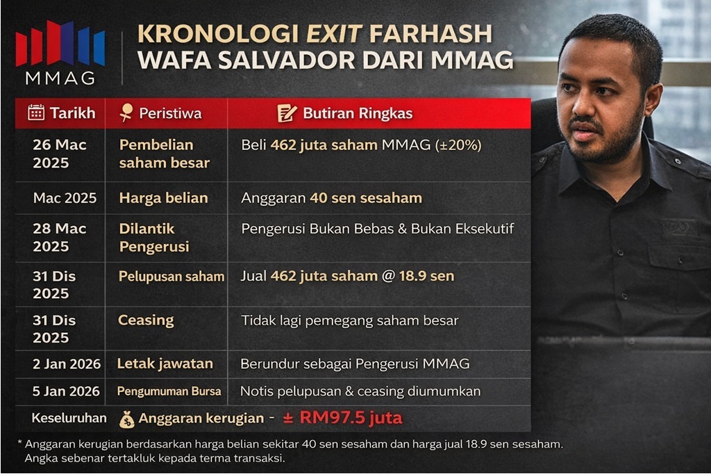 MMAG Holdings Berhad mengumumkan peletakan jawatan Dato’ Seri Farhash Wafa Salvador sebagai pengerusi syarikat itu, berkuat kuasa 2 Januari 2026, selepas beliau turut melupuskan keseluruhan pegangan sahamnya dalam kumpulan berkenaan.